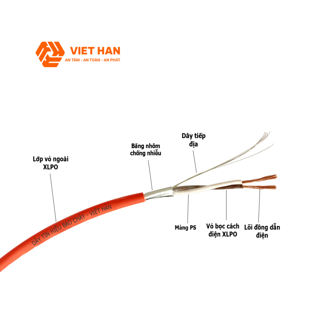 Vỏ ngoài của dây cáp tín hiệu báo cháy Việt Hàn được làm từ nhựa XLPO (Cross-linked Polyolefin) cao cấp. Đây là vật liệu có đặc tính chống cháy lan (Flame Retardant) cực tốt. Khi tiếp xúc với lửa, vỏ nhựa không bùng phát thành ngọn lửa lớn và hạn chế tối đa việc sinh ra khói đen hay khí độc – tác nhân chính gây ngạt trong các vụ hỏa hoạn.