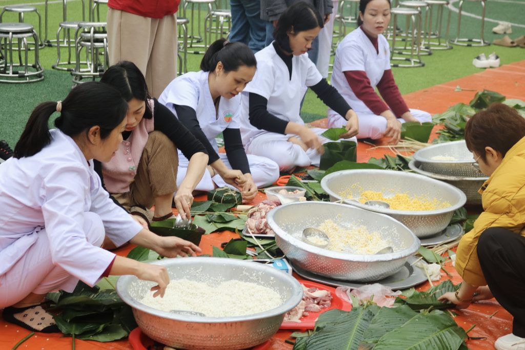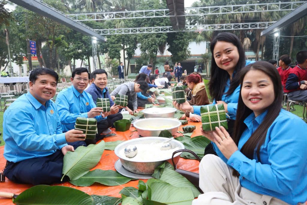 Nội dung thi gói bánh chưng đòi hỏi sự đồng nhất tuyệt đối. Dù đến từ 5 đơn vị khác nhau, nhưng dưới sự điều phối khéo léo, các thành viên đã phối hợp nhịp nhàng như một chỉnh thể thống nhất. Từng chiếc lá dong được xếp lớp, từng bát gạo nếp được đong đưa đều đặn, tất cả tạo nên những chiếc bánh chưng vuông vức, đẹp mắt. Đối với mỗi công đoàn viên, chiếc bánh trưng còn mang một tầng ý nghĩa đặc biệt và sâu sắc: Lá dong xanh bọc ngoài tượng trưng cho sự bảo vệ, chăm lo của tổ chức Công đoàn; Nhân đỗ, thịt mỡ bên trong thể hiện mong ước về sự ấm no, sung túc của đoàn viên; Sợi lạt giang dẻo dai chính là sợi dây đoàn kết, gắn bó máu thịt giữa ý Đảng và lòng dân; Mỗi lá dong xanh bao bọc các loại nhân ở bên trong cũng giống như Đảng và Nhà nước luôn che chở, chăm lo cho đời sống của mỗi đoàn viên, công nhân viên chức, người lao động.
